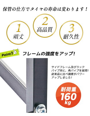 ≪ 製品仕様 ≫ 商品名 タイヤラック 商品サイズ 外寸サイズ:約幅1030×奥行610×高さ1170mm 収納有効内寸(横幅):960mm 下段ラック内寸(高さ):(100mmピッチで3段階調節可能) 下段位置…60mm 中段位置…70mm 上段位置…80mm 商品重量 10kg 耐荷重 160kg 梱包サイズ 約幅1100×奥行630×高さ60mm 材質 <素材> 本体:スチール、キャスター:スチール・合成ゴム、ネジ類:スチール、カバー:ポリエステル 150D(アクリルコート) <表面加工> 本体:メラミン樹脂焼付塗装、キャスター・ネジ類:ユニクロムメッキ 原産国 日本製 商品詳細 車2台分のタイヤを縦置きでスッキリ収納! 強力角パイプを採用し、強度がパワーアップ!グラつき防止のダブルロック機能も付いて、凹凸のある地面にもしっかり固定できます。